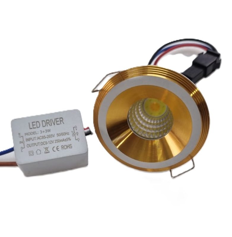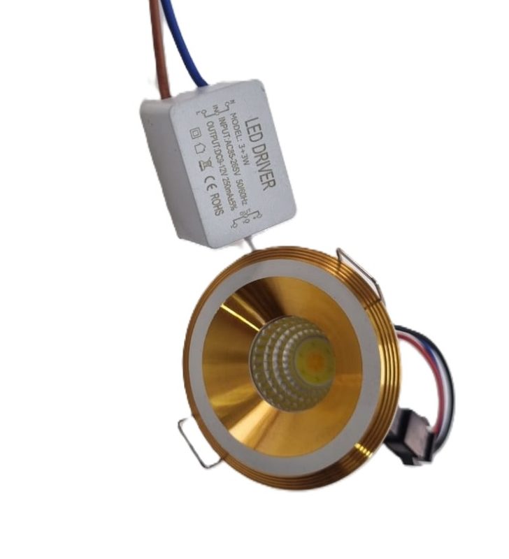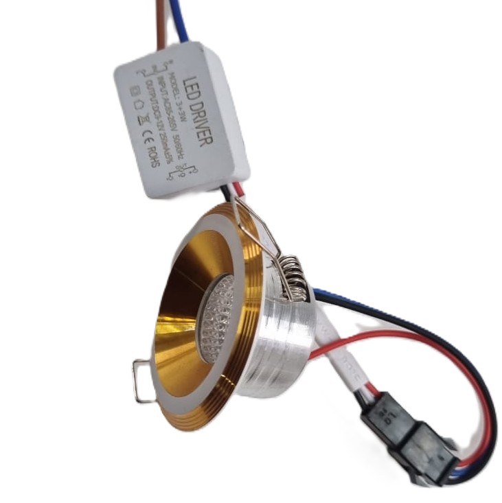 1-inch 3wt gold-colored recessed LED spotlight. This product is a mini recessed LED spotlight, a type of downlight designed for flush installation into a ceiling or other surface. Includes a separate LED driver. The spotlight has a round frame with a metallic gold or bronze finish, giving it a modern and decorative appearance.