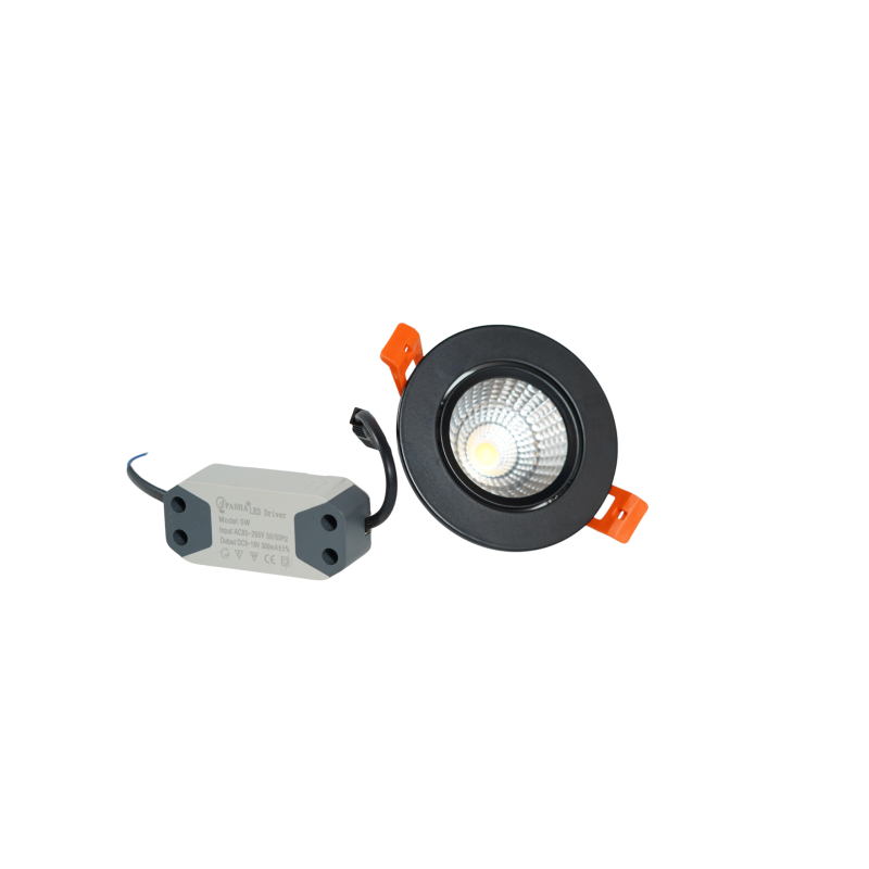 গোলাকার কালো রিসেসড LED ডাউনলাইট বা স্পটলাইট যার সাথে আলাদা এক্সটার্নাল ড্রাইভার থাকে। এই লাইটগুলি সাধারণত বিভিন্ন ওয়াটেজ এবং আকারে অভ্যন্তরীণ অ্যাকসেন্ট বা সাধারণ আলোর জন্য পাওয়া যায়। প্রকার: চিপ-অন-বোর্ড (COB) প্রযুক্তি সহ রিসেসড LED স্পটলাইট। নকশা: আলো ফোকাস করার জন্য একটি অন্তর্নির্মিত প্রতিফলিত শঙ্কু সহ একটি কালো অ্যালুমিনিয়াম বডি রয়েছে। এতে একটি এক্সটার্নাল LED ড্রাইভার (পাওয়ার সাপ্লাই) রয়েছে যা সাধারণত কম-ভোল্টেজ LED লাইটের জন্য প্রয়োজন। ইনস্টলেশনের মধ্যে সিলিংয়ে একটি গর্ত কাটা এবং কমলা স্প্রিং ক্লিপ দিয়ে ফিক্সচারটি সুরক্ষিত করা জড়িত। উপাদান: প্রাথমিকভাবে একটি অ্যালুমিনিয়াম খাদ দিয়ে তৈরি, যা দক্ষতার সাথে তাপ অপচয় করতে সাহায্য করে। ভোল্টেজ: বাহ্যিক ড্রাইভার সাধারণত একটি বিস্তৃত ইনপুট ভোল্টেজ পরিসর গ্রহণ করে, যেমন AC 85V–265V।