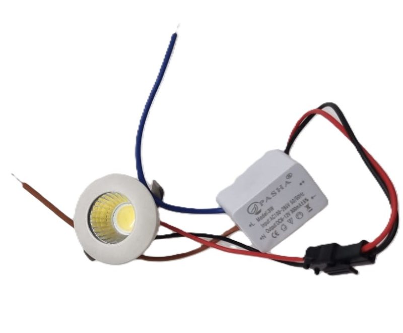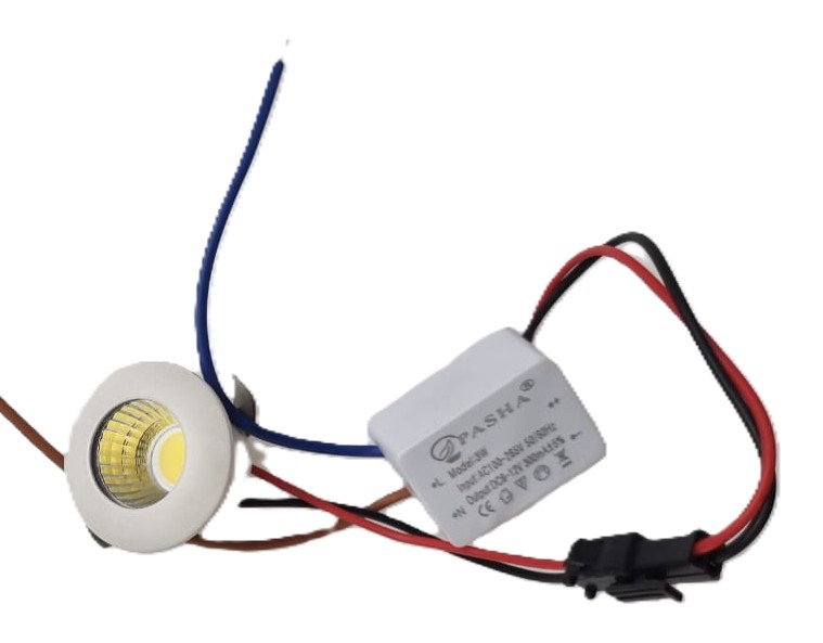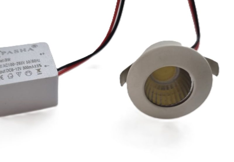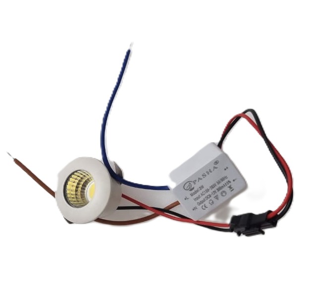 3/4 Inch -3Wt mini recessed LED spotlight. This product is a mini recessed LED spotlight, a type of downlight designed for flush installation into a ceiling or other surface. It is branded as “Pasha” and includes a separate LED driver.