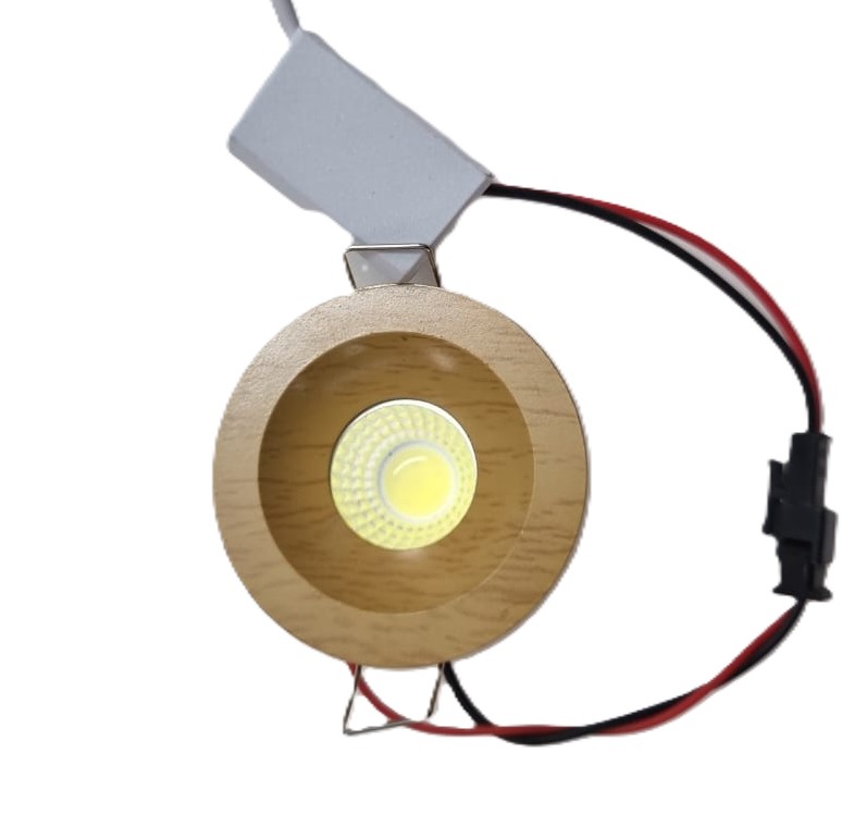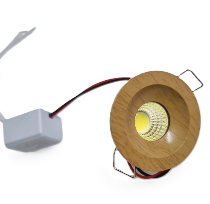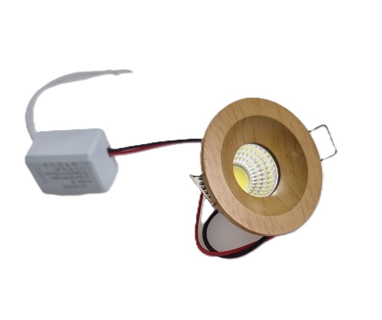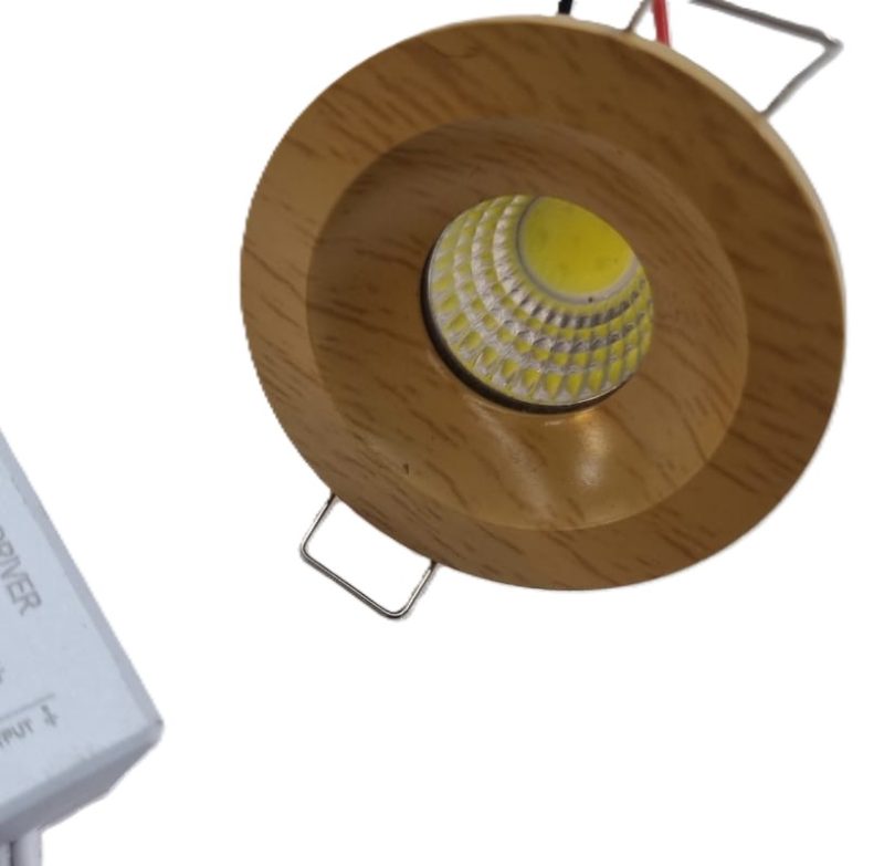 A 3-watt LED Down Spot light is a type of Recessed LED spotlight, featuring a round frame with a wooden color finish. It is designed for flush installation into a ceiling, creating a clean and modern aesthetic.