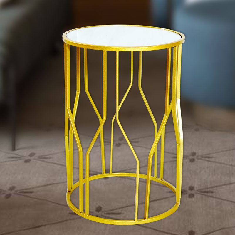 It features a distinctive round tempered glass top supported by a yellow metal frame with an intricate geometric design. Primarily, it is used in living rooms, bedrooms, or balconies for decorative purposes.(Product Code- 4SHDL-001side table)