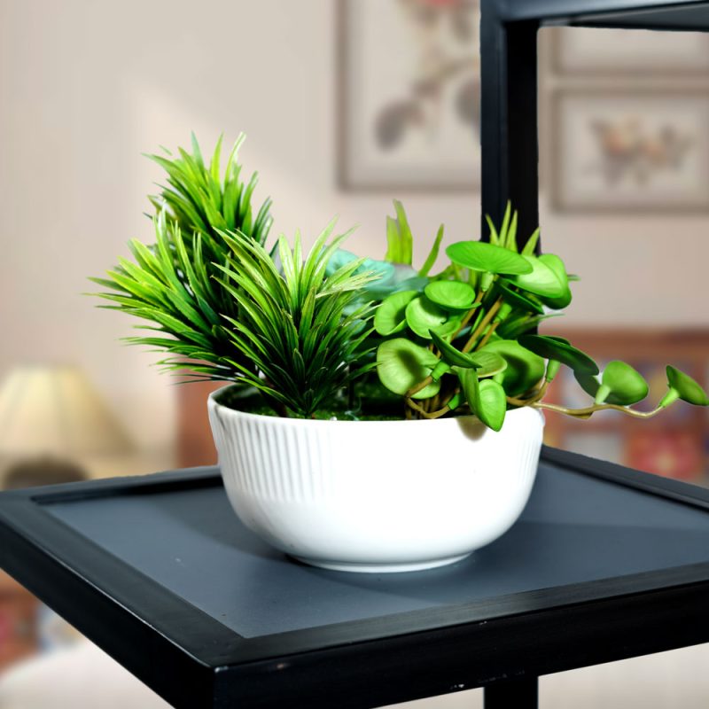 এই জিনিসটি একটি কৃত্রিম উদ্ভিদ বিন্যাস যা মিশ্র নকল সবুজের সমাহার, যার মধ্যে রয়েছে কাঁটাযুক্ত ঘাস এবং পিছনের রসালো পাতা, যা একটি সাদা, পাঁজরযুক্ত সিরামিক বাটি-আকৃতির প্লান্টারে স্থাপন করা হয়েছে। গাছপালা প্লাস্টিক বা সিন্থেটিক উপকরণ দিয়ে তৈরি, এবং পাত্রটি সিরামিক দিয়ে তৈরি।