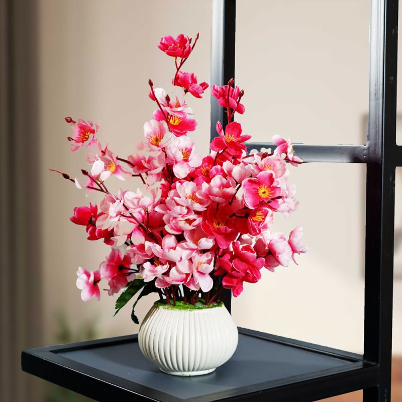This item is an artificial cherry blossom flower arrangement set in a white, ribbed, low-profile ceramic vase. The vibrant pink faux flowers and stems are likely made from plastic or silk, designed for tabletop decoration in homes or offices.