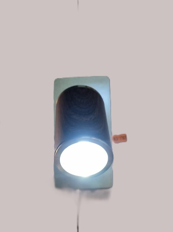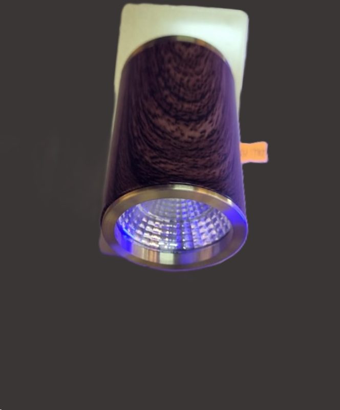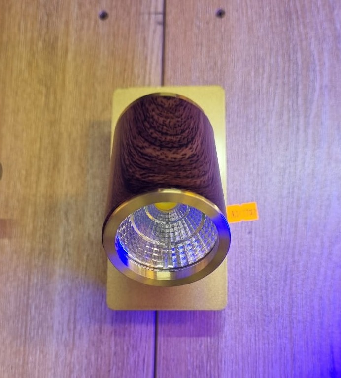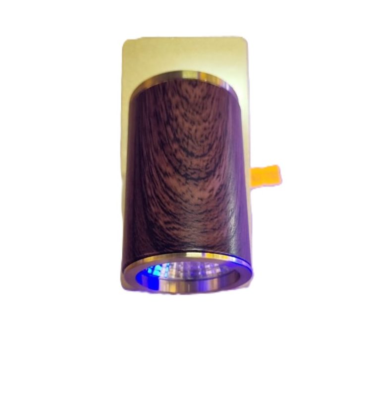 This is a cylindrical LED wall basin spotlight with a wood-grain finish. The light fixture has a dark wood-like body with metallic rings at the top and bottom. Similar fixtures are often used for indoor lighting, especially in modern or minimalist interior designs, and may be referred to as an LED downlight or spotlight. The LED technology provides energy-efficient and bright light.