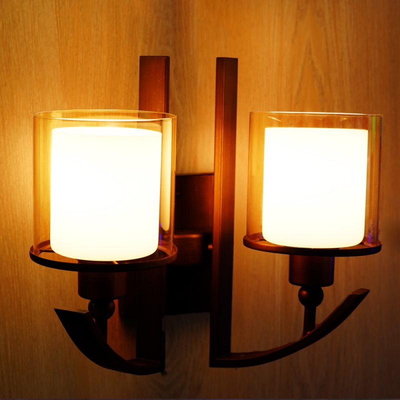 The light reflects a contemporary aesthetic, likely featuring a sleek design and a dual glass shade or a single fixture with two light sources, providing a warm and inviting glow.