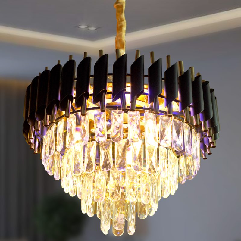 এই ঝাড়বাতিটি একটি মসৃণ, আধুনিক নকশার সাথে একটি গোলাকার, স্তরযুক্ত কাঠামোর বৈশিষ্ট্যযুক্ত। এটিতে কালো ফ্রেমের উপরের অংশের একটি আকর্ষণীয় বৈসাদৃশ্য রয়েছে যার সাথে ক্যাসকেডিং স্বচ্ছ স্ফটিক বা কাচের উপাদান রয়েছে যা একটি ঝলমলে আলো তৈরি করে।এই ফিক্সচারটি গোলাকার আকৃতির, যার উপরের স্তরে উল্লম্ব কালো ধাতব ব্লেড বা টিউব রয়েছে এবং নীচের অংশটি অসংখ্য স্বচ্ছ, মুখযুক্ত স্ফটিকের ফোঁটা দিয়ে তৈরি যা আলোকিত হলে ঝলমল করে। এটি একটি সমসাময়িক নকশা প্রদান করে যা বসার ঘর, ডাইনিং রুম, প্রবেশপথ এবং হোটেল লবিতে ভালোভাবে কাজ করে, আধুনিক এবং ক্লাসিক উপাদানের মিশ্রণ।