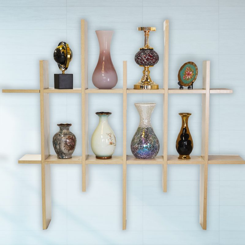 শেল্ফগুলি একটি মডুলার, ইন্টারলকিং ডিজাইন যা অনুভূমিক শেল্ফ এবং উল্লম্ব ডিভাইডার উভয়ই একসাথে স্লাইড করে একটি অনন্য গ্রিড বা ঘনক্ষেত্রের মতো কাঠামো তৈরি করে। ব্যবহৃত উপাদানটি সাধারণত একটি টেকসই ইঞ্জিনিয়ারড কাঠ যা একটি প্রাকৃতিক ফিনিশ সহ, যা ঘর সাজানোর জন্য একটি হালকা কিন্তু মজবুত ডিসপ্লে সমাধান প্রদান করে।