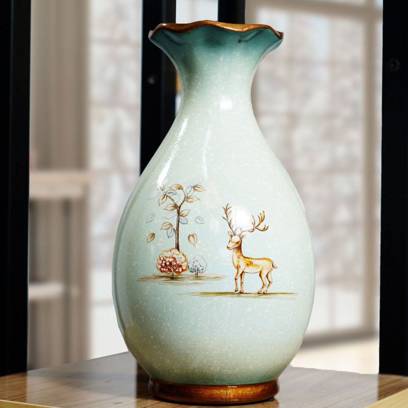 This rustic charm and artistic elegance. This beautiful piece features a serene hand-painted design of a majestic deer and stylized trees, set against a calming, subtly variegated glazed background that evokes natural tranquility.Celadon-glazed ceramic vase featuring hand-painted natural motifs. The specific weight depends on the exact size, which can vary by retailer. The vase has a classic bulbous body and a ruffled, scalloped rim. It features a light, crackle-finish celadon or pale blue-green glaze. The decorations are hand-painted, depicting a deer standing next to a small, artistic tree. This style is reminiscent of traditional Chinese art, where the deer (lu) is a symbol of “bureaucratic benefits,” prosperity, and grace. The base and rim have a subtle gilt or gold-tone finish.