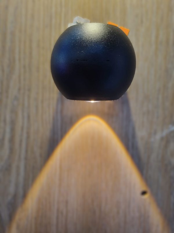 Spherical Downlight or wall sconce. It features a matte black, orb-shaped body that is mounted to the wall, casting a focused beam of light downwards onto the surface below. This design is often referred to as an “orb wall light” or a “globe sconce” and is popular in contemporary and minimalist interior styles.