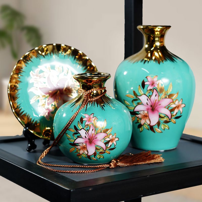 তিন-পিস আলংকারিক সিরামিক সেট, যার মধ্যে রয়েছে প্রাণবন্ত ফিরোজা গ্লেজ, সোনালী রঙের উচ্চারণ এবং হাতে আঁকা গোলাপী ফুলের নকশা। সেটটিতে রয়েছে একটি বড় ফুলদানি, একটি ছোট বাল্বস ফুলদানি যার একটি আলংকারিক ট্যাসেল এবং একটি ছোট স্ট্যান্ডে একটি ডিসপ্লে প্লেট। টুকরোগুলি স্টাইলাইজড গোলাপী এবং সাদা ফুল এবং সবুজ পাতা দিয়ে সজ্জিত একটি চকচকে ফিরোজা ফিনিশ দ্বারা চিহ্নিত করা হয়েছে। ফুলদানির রিম এবং বেস, সেইসাথে প্লেটের রিম এবং সেন্টার ডিজাইনে, বিশিষ্ট সোনালী রঙের ট্রিম রয়েছে, যা একটি বিলাসবহুল, ক্লাসিক ইউরোপীয় বা চীনা শৈলীর নান্দনিকতা যোগ করে। ছোট ফুলদানিতে একটি আলংকারিক বাদামী এবং সোনালী দড়ি রয়েছে যার গলায় একটি ট্যাসেল বাঁধা রয়েছে।