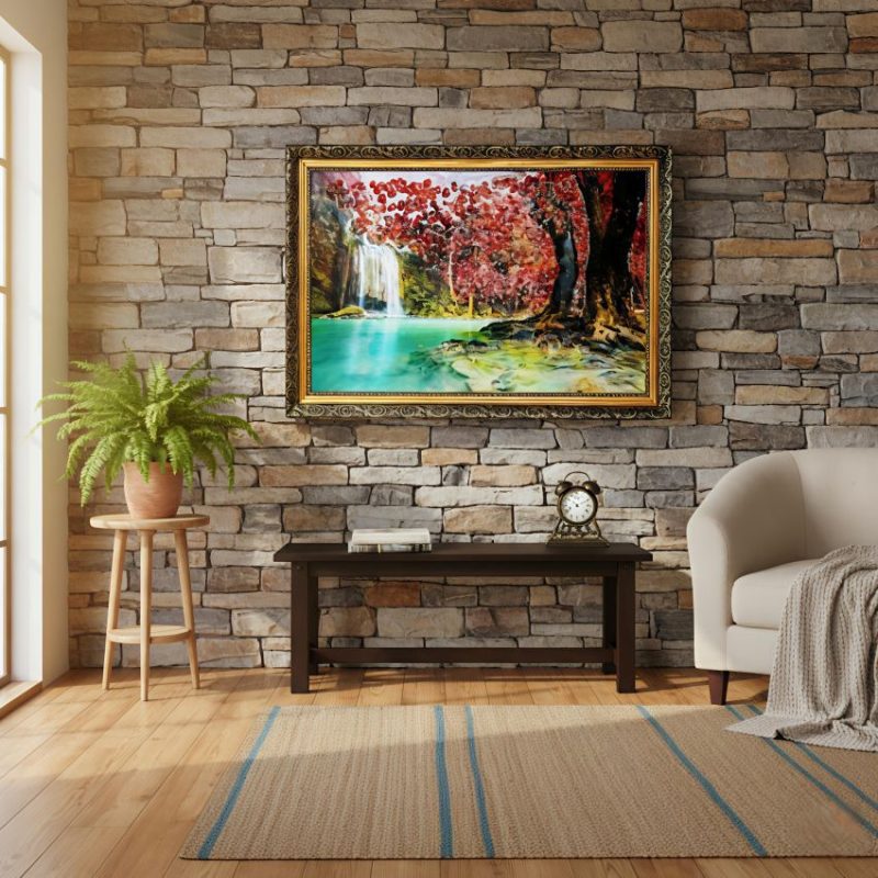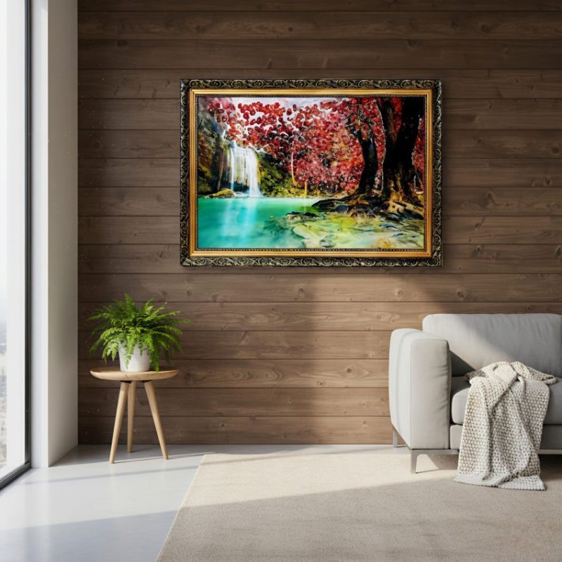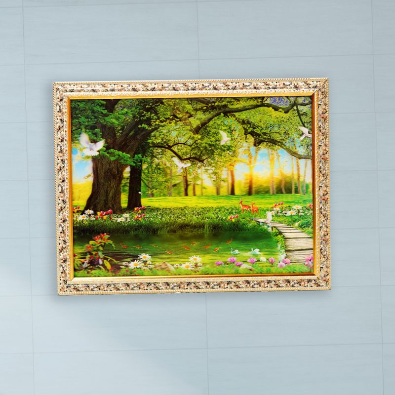 এই অসাধারণ তৈলচিত্রটি বিকেলের শেষের সূর্যের উষ্ণ আলোয় স্নাত একটি মৃদু প্রবাহমান নদীর সাথে একটি শান্ত বনের দৃশ্য ধারণ করে।একটি ক্যানভাস প্রিন্ট 3D ইফেক্ট পোস্টার প্রিন্ট যাতে একটি উজ্জ্বল, সূর্যালোকিত বনের দৃশ্য রয়েছে যেখানে একটি পুকুর, সবুজ ঘাস, বড় গাছ, একটি ছোট পথ, ফুল এবং হরিণ রয়েছে। এটিতে একটি বিশদ, প্রাকৃতিক শৈলী রয়েছে যার উজ্জ্বল রঙ রয়েছে। শিল্পকর্মটি একটি বিশিষ্ট, অলঙ্কৃত সোনালী রঙের ফ্রেমে সাজানো হয়েছে যার জটিল আলংকারিক নকশা রয়েছে, যা একটি ক্লাসিক বা ভিনটেজ নান্দনিকতা যোগ করে। ফ্রেমের উপাদান প্রায়শই হালকা প্লাস্টিক বা কাঠের সংমিশ্রণ।