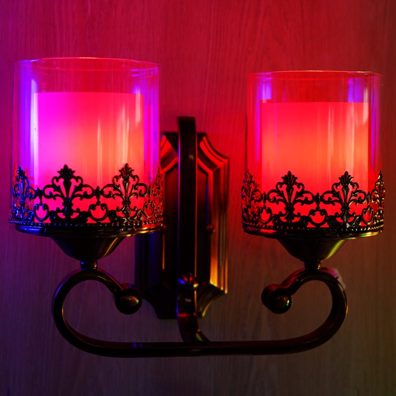 It features a decorative and ornate metal base and arm that support two separate light sources. The base has intricate scrollwork, giving it a classic or vintage aesthetic.(Product Code- 4SHDL-WB-02)